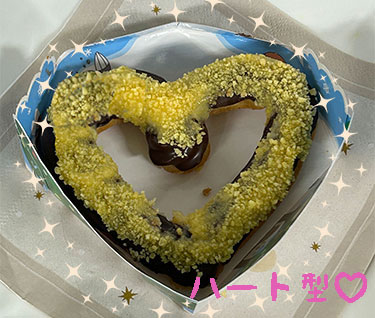 土台は、ハート形のチュロ生地のドーナツに、チョコレートが、コーティングされており、カスタ ードクリームとゴールデントッピングで、モチモチしっとり食感で、こちらも食べ応え満点です( >∀< )