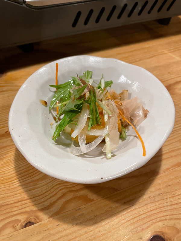まぁ、それは、よしとして、もつ鍋を注文し、先に注文した、芋焼酎のお湯わりとお通しをいただきながら、しばし、鍋を待つ。