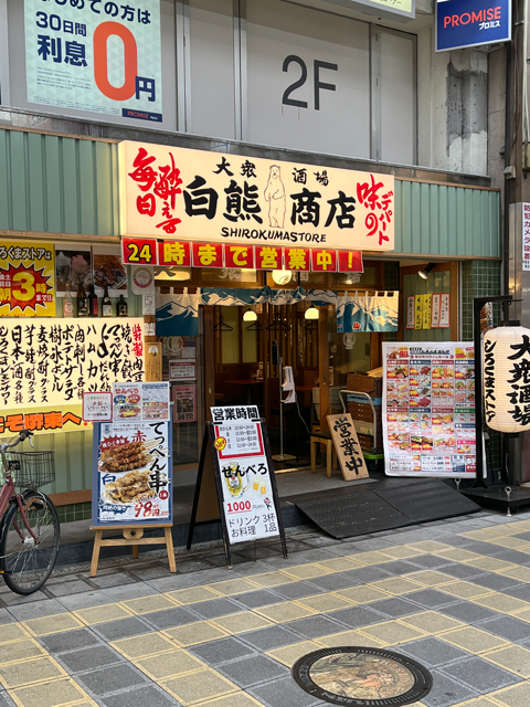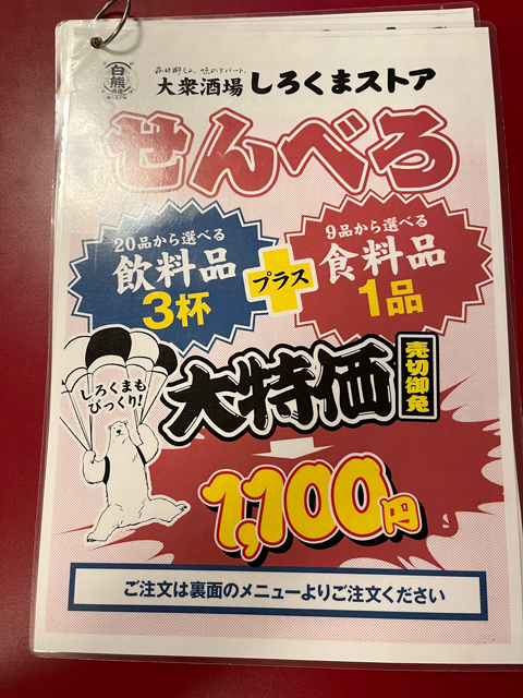 堺東に業務で行った私は、終了後に、『しろくまストア 堺東駅前店』さんの前を通りかかるとせんべろ、1100円という看板が!!