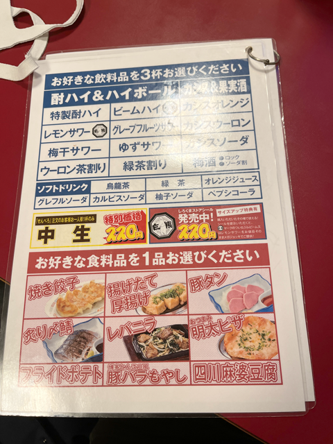 なんだ、せんべろか。と思いつつ、看板をよくよく見ると、なんと、ドリンク三杯!!あて一品付きではないか!!
