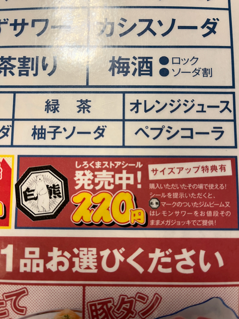 このシールは一度購入すれば、 次回来店以降も、ジョッキハイボールやレモンサワーが 無料でメガサイズにサイズアップできるという お酒好きには、嬉しいシステムだ。お得お得! どうも、せんべろセットでも使えるらしい。