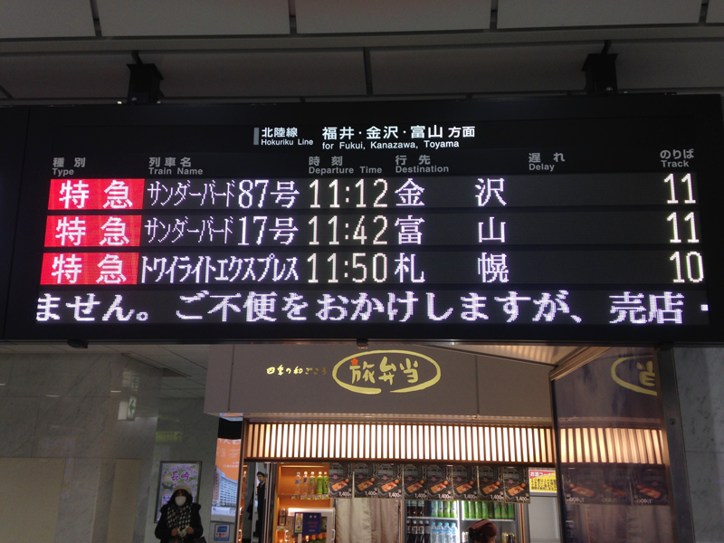 そして、特急専用ホームの11番乗り場。2009年(平成21年)12月20日にリニューアルされた最も新しいホームです。現在では主に日中は北陸特急「サンダーバード」号、深夜に寝台特急「サンライズ瀬戸・出雲」号が発着しています。