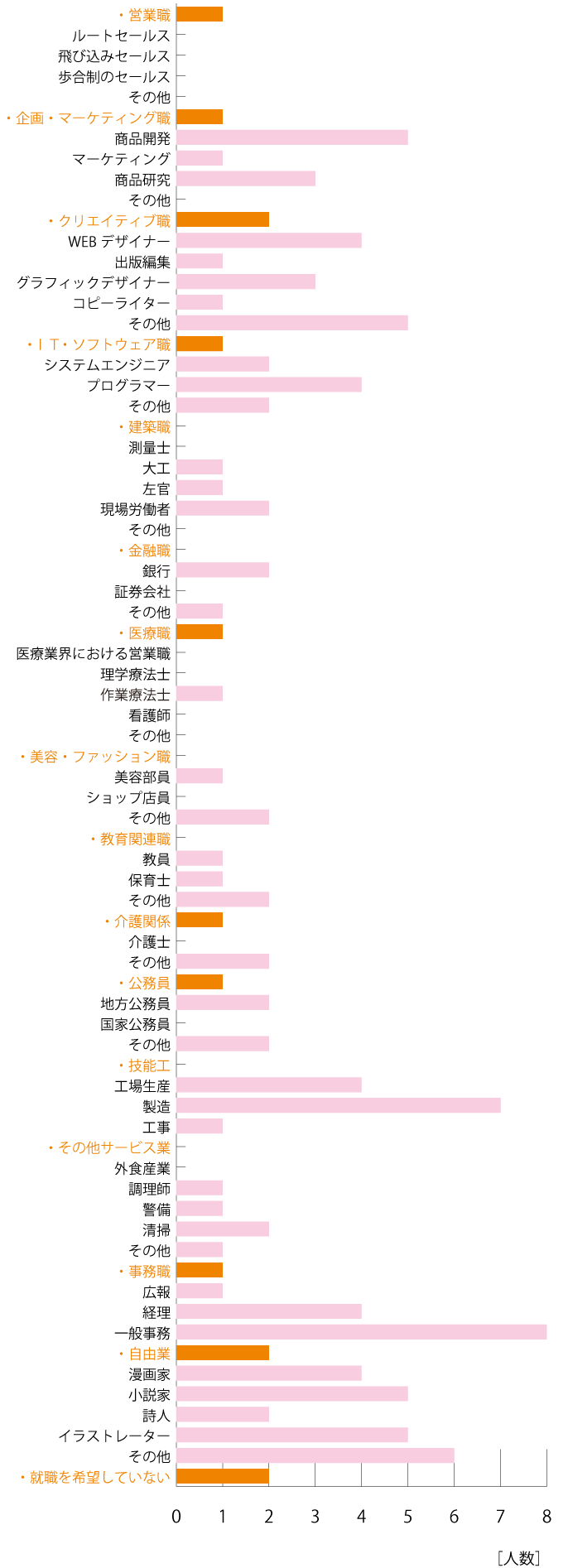 人によっていろいろな職種を望まれるのがよくわかります。その中でも製造や一般事務、クリエイティブ系が人気のようです。また、小説家やイラストレーターなどの自由業も人気なのがわかりました。
