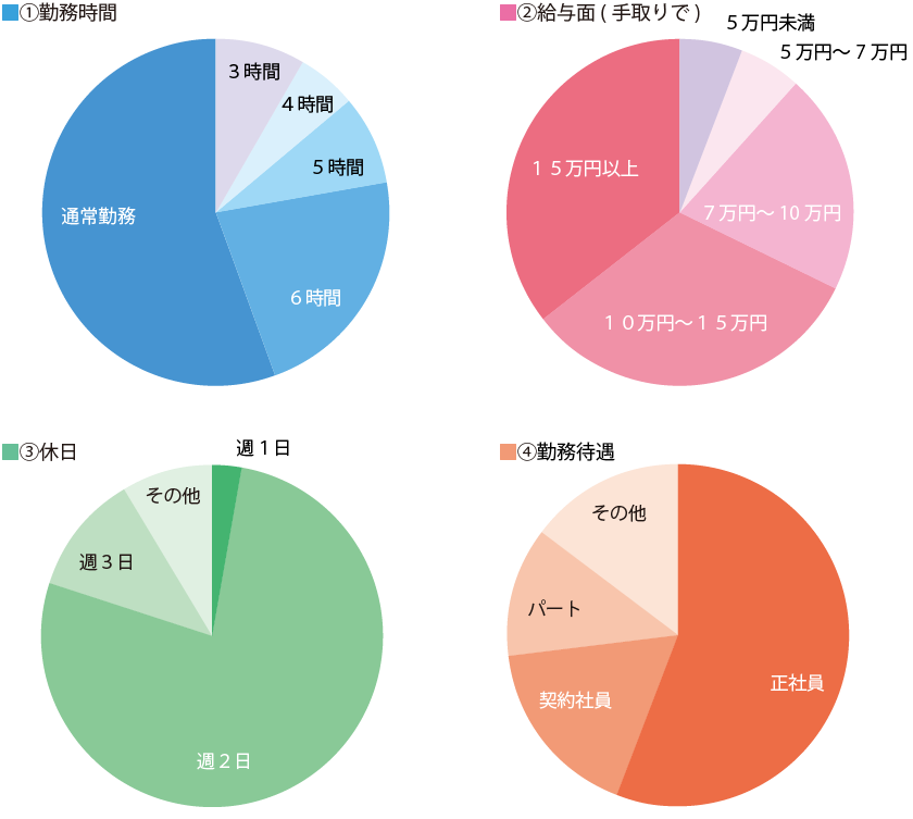 通常勤務、手取りで15万円以上、週休2日、正社員がそれぞれ多いようです。つまりは、規則正しく仕事ができて、生活が安定している状態をとても望まれているのがよくわかります。仕事はしたものの生活が成り立たないのでは辛いですものね。