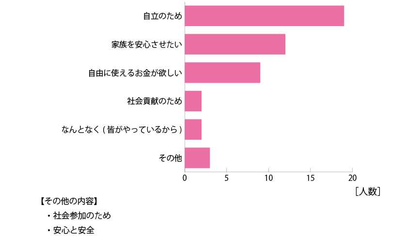 お仕事は「自立のため」「家族を安心させたい」という思いを持ってらっしゃる方が多いようです。「自由に使えるお金が欲しい」というのも大事な欲求ですね。お金は独立にとても大事なものです。