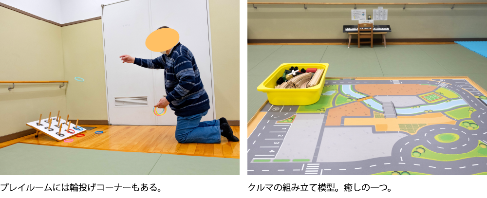 ここも、子供からお年寄りまで幅広く利用されています。輪投げやゲーム、パズルなど、静かな環境で遊ぶことができます。車いすなどの重度障害者の方も、寝そべるなど背筋を伸ばすこともできます。リラクゼーションの場ともなっています。