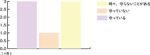 グラフを見ると、きちんと「医師の注意を守っている」方がおられるなか、「時々、守らない ことがある」方が同数でした。また「守っていない」という方は、ごく一部で、これは、守りたいけれど、うまくいかないという方もおられるではないかと思われます。